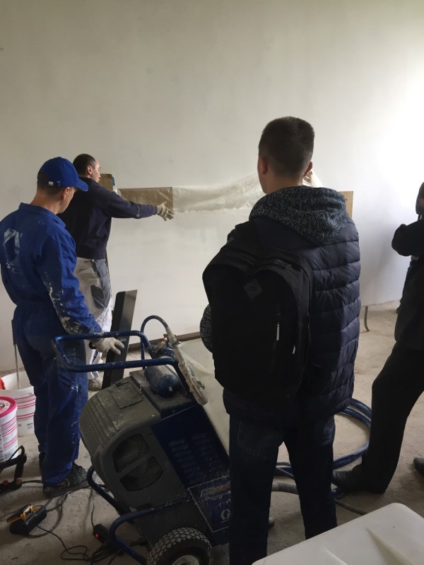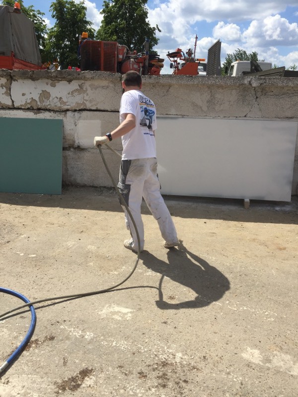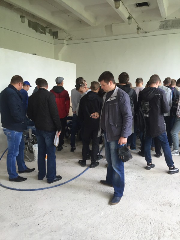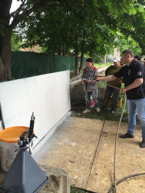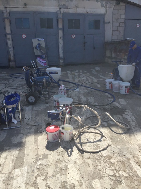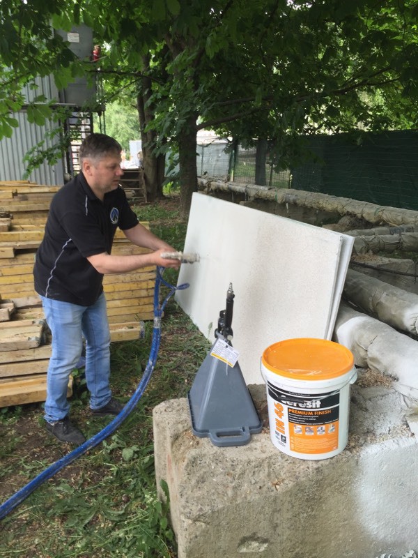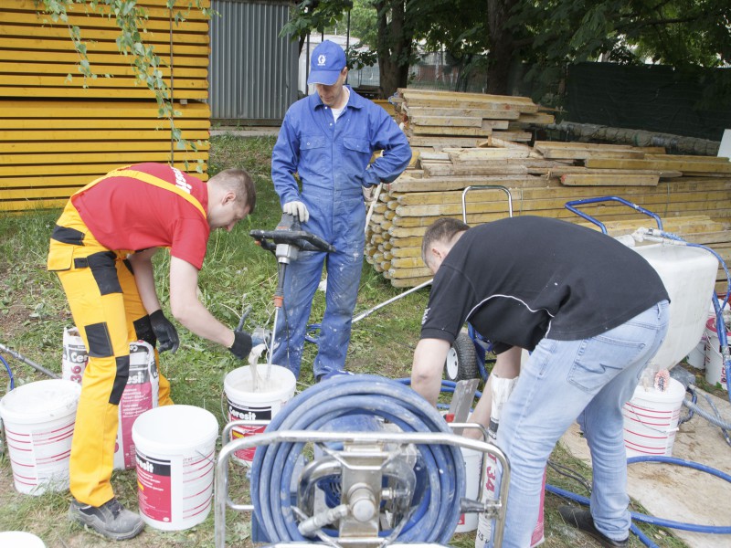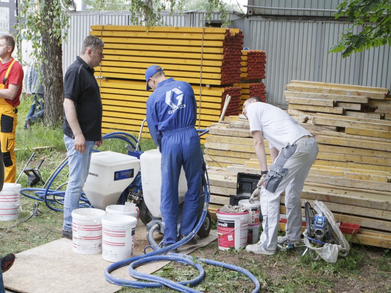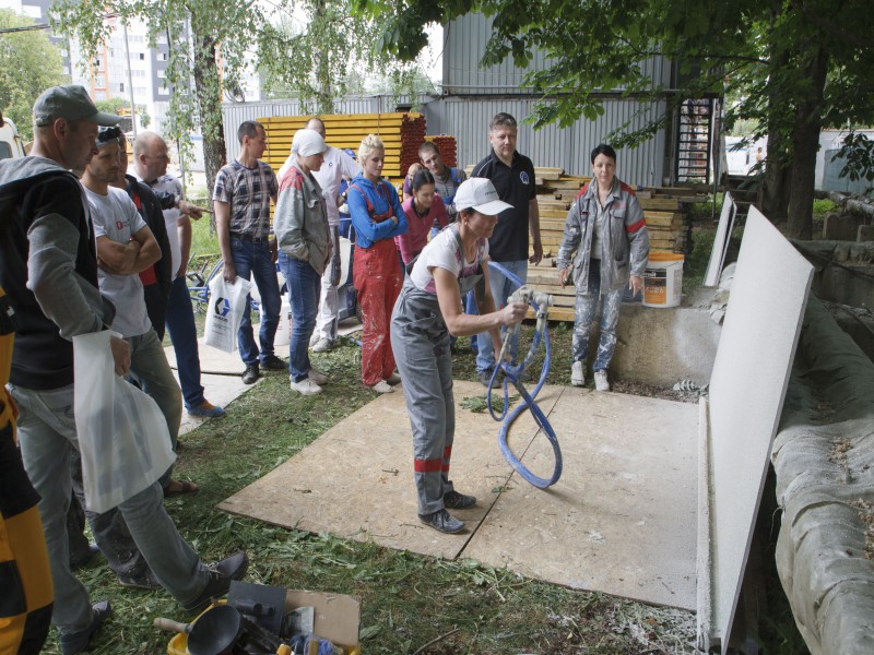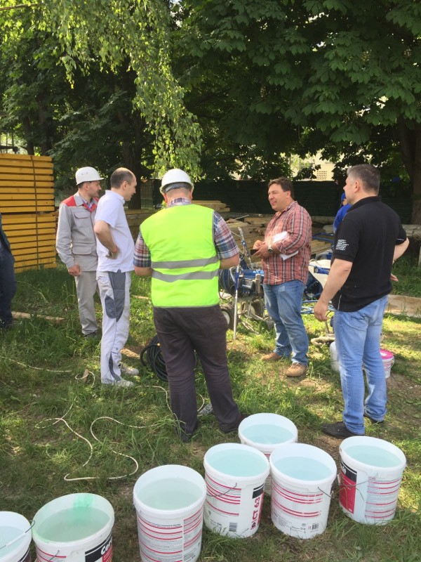 Были представлены окрасочные агрегаты: GX21, КА190, Мark VII, АРХ 6200, RTX 5500, распылитель вязких материалов (хоппер). Были нанесены материаллы: шпатлёвка гипсовая СТ 126, шпатлёвка цементная СТ 34, шпатлевка полимерная IN 46, штукатурка камешковая СТ 174 (1,0), гидроизоляция пенополистерольная СР 1, краска акриловая СТ 42.
